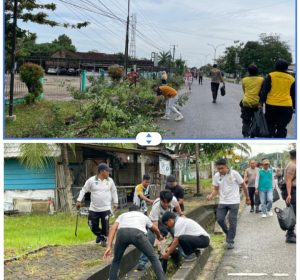 Dengan peralatan sederhana seperti sapu lidi, cangkul, parang, kantong sampah, dan perlengkapan kebersihan lainnya, para personel bekerja bahu membahu membersihkan fasilitas umum dan ruang publik.